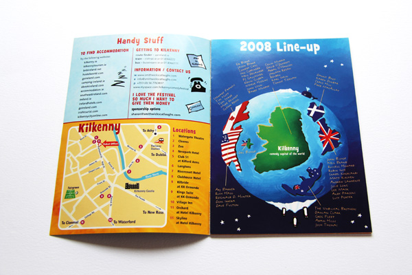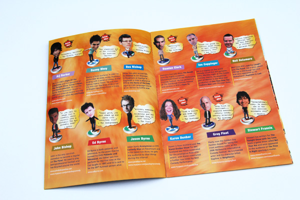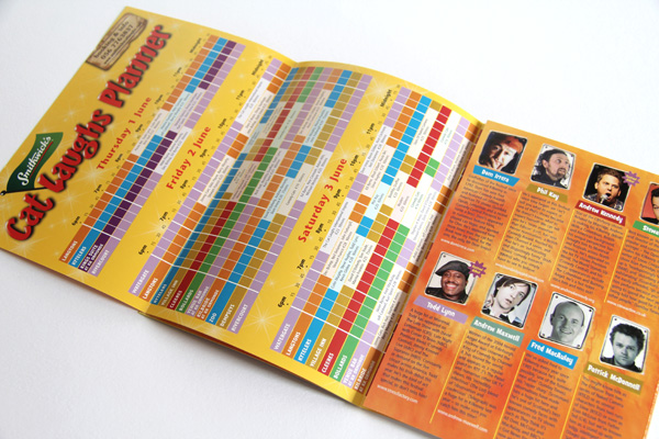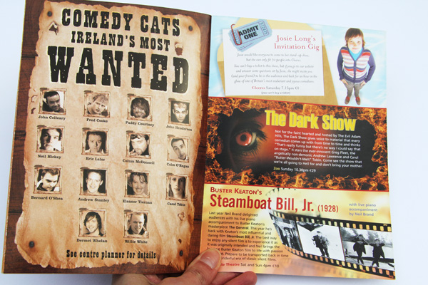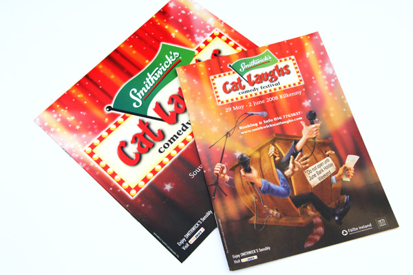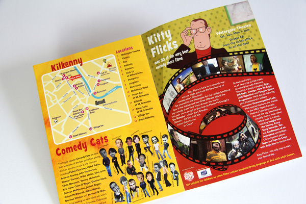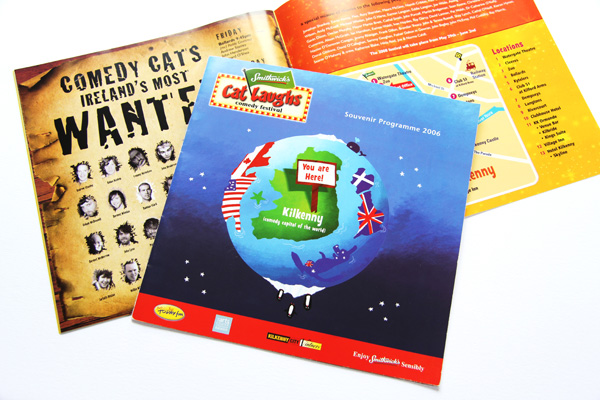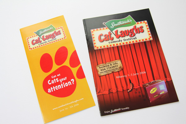 The challenge for the design of the Cat Laughs Comedy Festival brand was to convey the Festival’s individuality and laidback but cheeky personality and keep elements of the cat, while at the same time meeting the branding regulations of the Title Sponsor. Our initial task was to find a way to explain the relationship between the two parts. After some thought, and design exploration, we focused on the concept of all the comedy shows taking place at night and the idea that the Festival would light up the night with live comedy and entertainment. The proportions of the two identities were explored to create a cohesive identity. Once the brand concept was created it was rolled out across the programme brochure, invitations, posters, pop-up stands, advertisement and t-shirts.